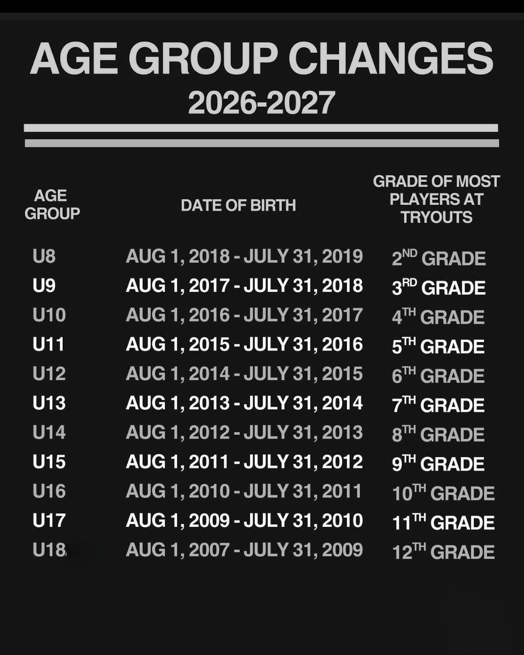 We will be using the 2026/2027 soccer season to determine your age group. Please click on the 2026-2027 Birth Chart to confirm you register for the correct age group.